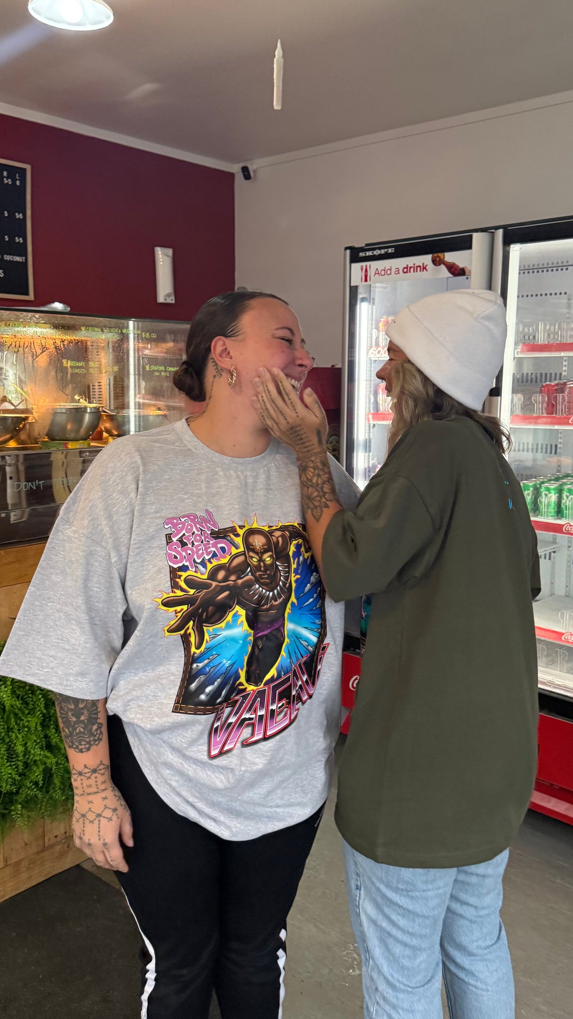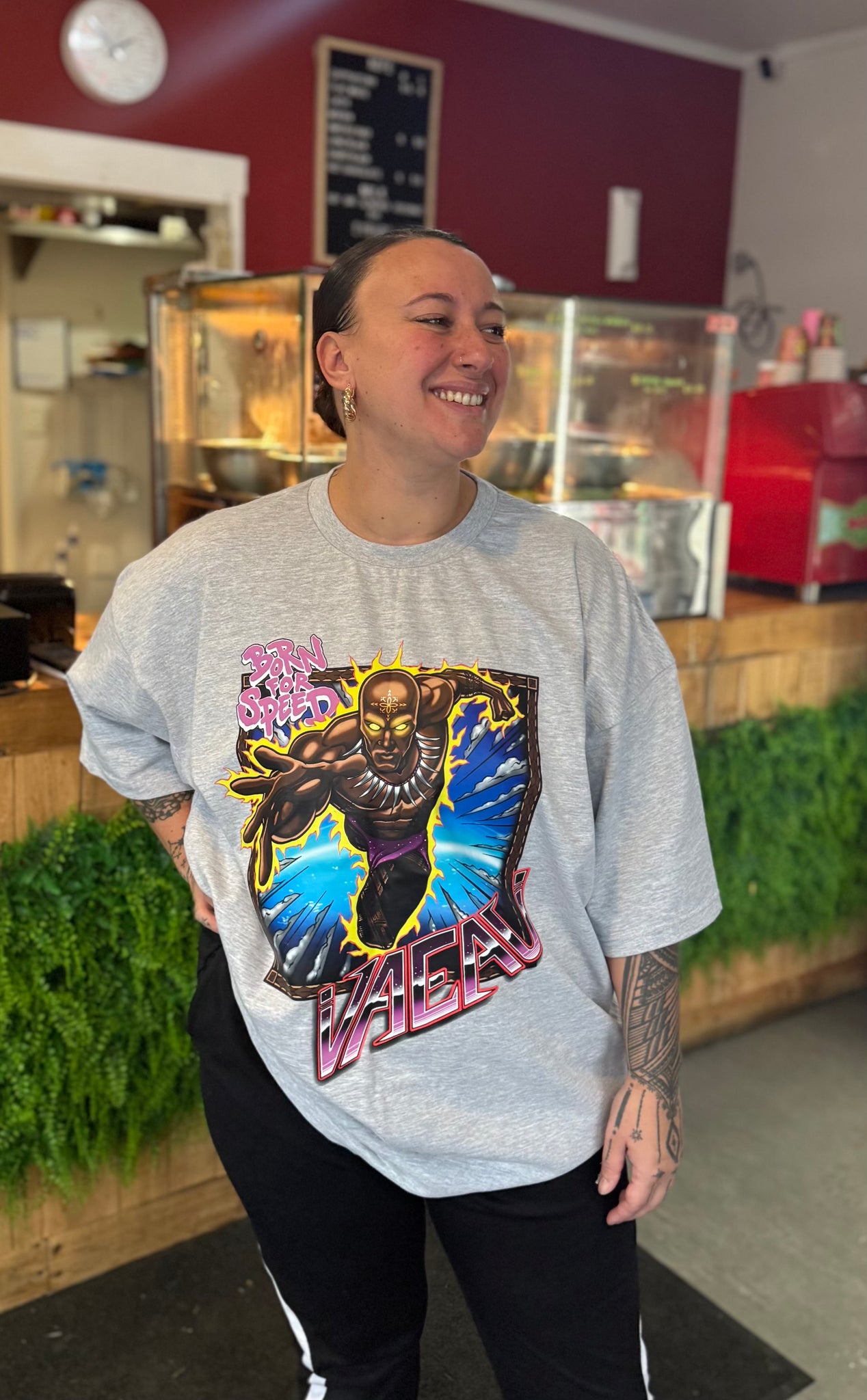 The first original design by Hiram Fa’alia Vaeau in a series inspired by the vintage island tees your aunties and uncles used to wear. A representation of the story of Vaeau, a servant known for his swiftness who could run between the heavens and the earth within a day. Ia e vae a Vaeau - may your legs be like those of Vaeau, born for speed.